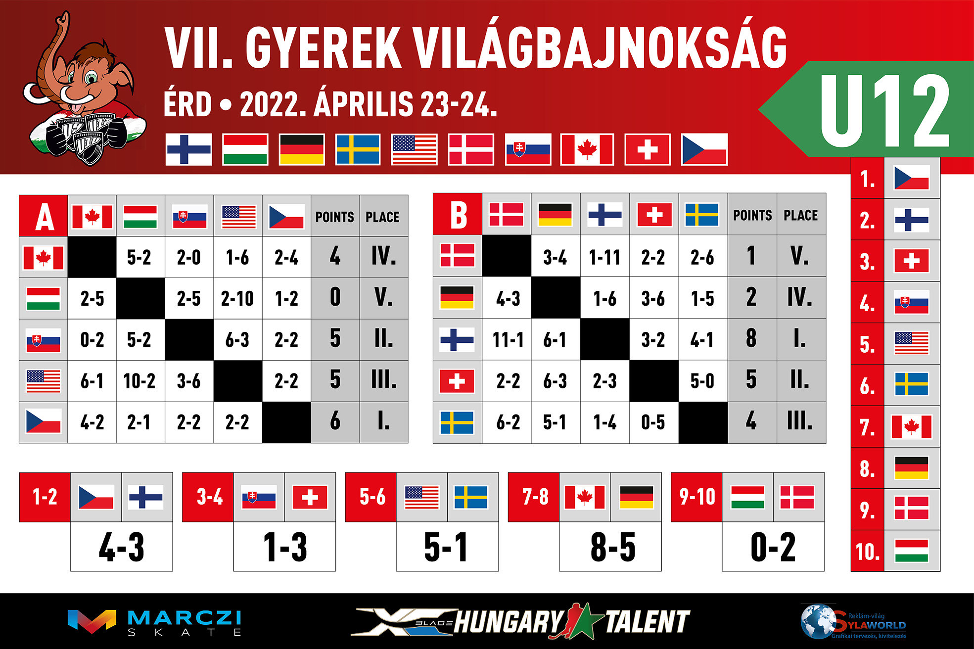 A táblázatban látható mind a 25 mérkőzés eredménye – a dobogó legmagasabb fokára Csehország állhatott fel, ami azt jelenti, hogy címvédés történt, hiszen 2021-ben is ők nyertek.