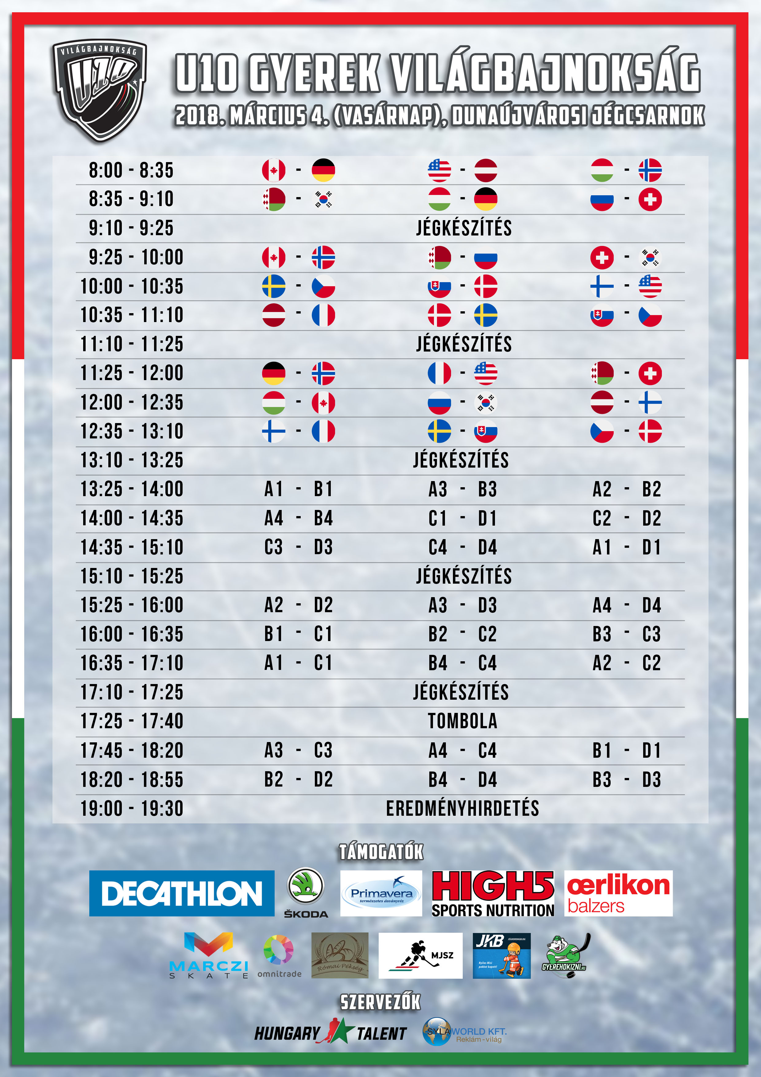Elkészült az U10 Jégkorong Gyerekvilágbajnokság sorsolása! A menetrendet a képen láthatjátok! Minden más információról hamarosan értesítést küldünk e-mailen az összes résztvevőnek (mikor lesz a regisztráció, hányas öltözőben fognak öltözni a gyerekek, mikor lesz az étkezés stb.). Osztani továbbra is ér a posztjainkat!:)