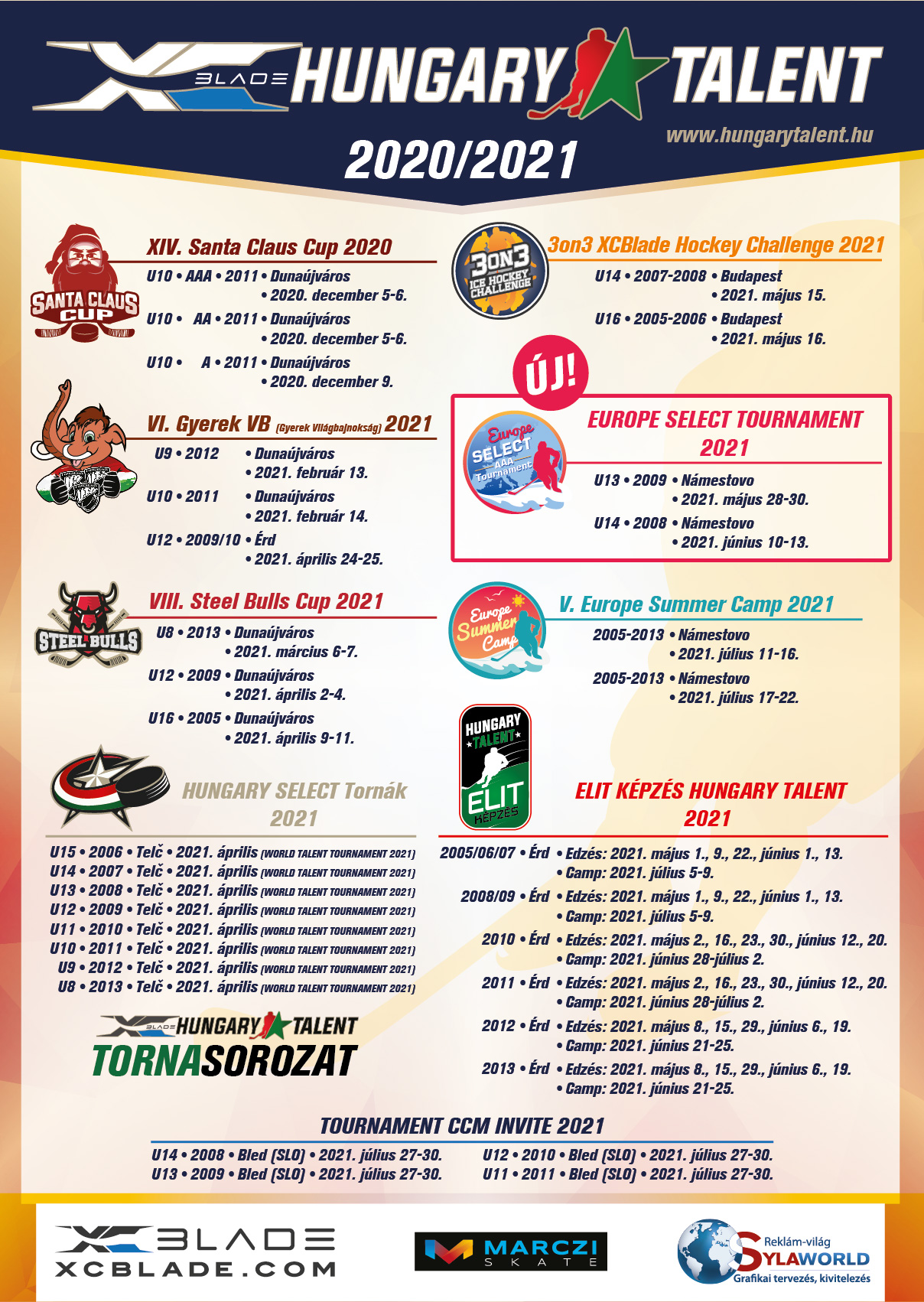 A plakáton láthatóak a sokaknak már ismerős események, mint a Gyerek Világbajnokság, a Santa Claus Cup, a 3-on-3 Ice Hockey Challenge, a Europe Summer Camp vagy az Elit Képzés, azonban az idei évtől egy új program is csatlakozik a többihez: a Europe Select Tournament. Az első évben egy régi ismerős helyszínen, Szlovákiában, Namestovóban szervezzük meg - és abban bízunk, hogy ezzel a tornával is szép hagyományt indíthatunk el, és emelni tudjuk a színvonalat, hogy a magyar játékosok is nemzetközi szinten tudjanak fejlődni. Az idei évben a 2008-as és 2009-es korosztály képviseli majd Magyarországot.