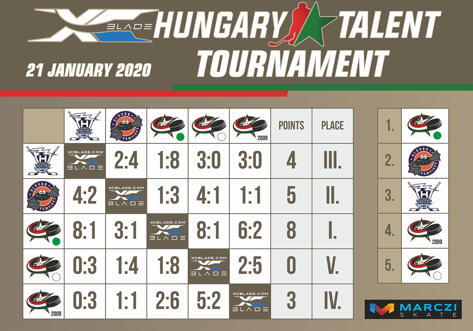 Idén a szlovák csapat mellett egy cseh gárda is elfogadta a meghívásunkat, így 5 csapatos tornát tudtunk szervezni most először, hiszen eddig mindig négy csapat versenyzett. Így három Hungary Talent csapat tudott jégre lépni: a 2008 White és Green, illetve a 2009-es alakulat.